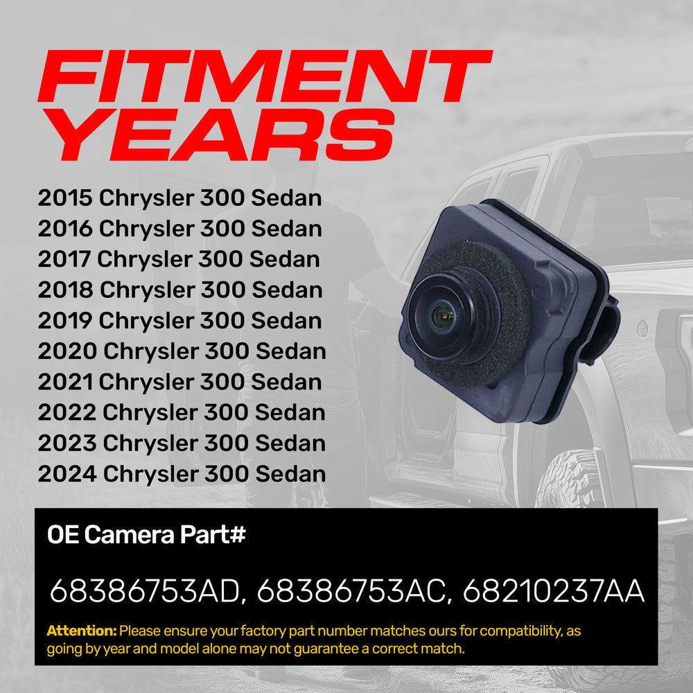 Chrysler 300 Sedan (2015-2024) OEM Replacement Backup Camera OE Part # 68386753AC, 68386753AD, 68210237AA